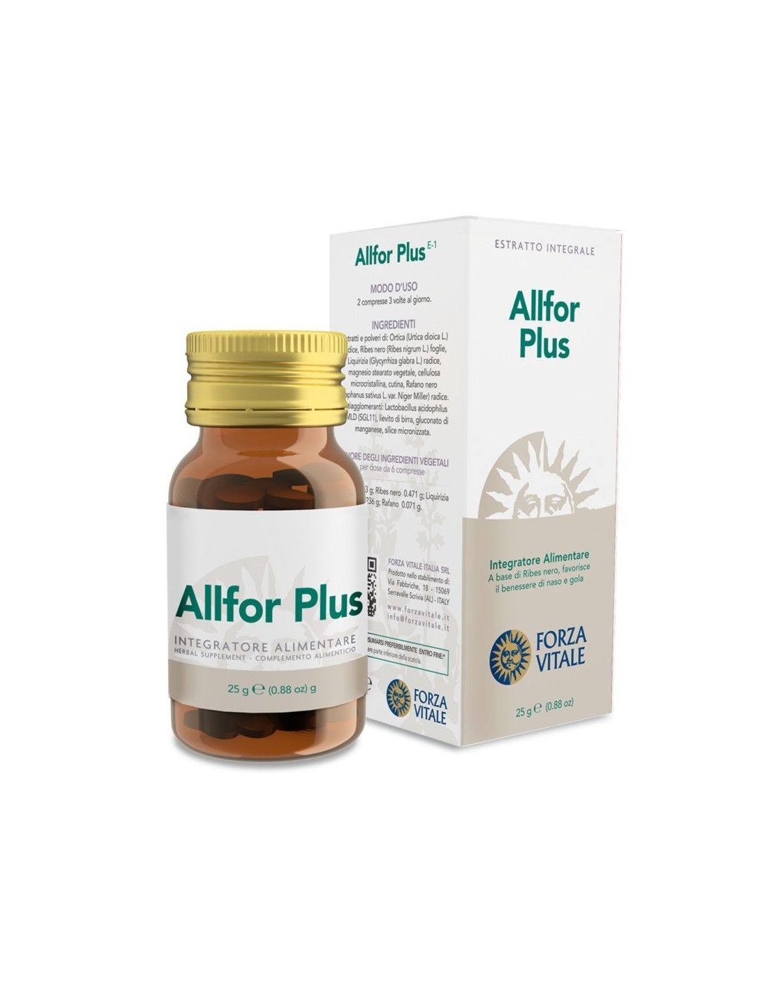 Estratti e Polveri di: Ortica (Urtica dioica L.) radice, Ribes nero (Ribes nigrum L.) foglie, Liquirizia (Glycyrrhiza glabra L.) radice, Magnesio stearato vegetale, Cellulosa microcristallina, Cutina, Rafano nero (Raphanus sativus L. var. Niger Miller) radice, antiagglomeranti: Lactobacillus acidophilus 10 MLD (SGL11), Lievito di birra, Gluconato di Manganese, Silice micronizzata.