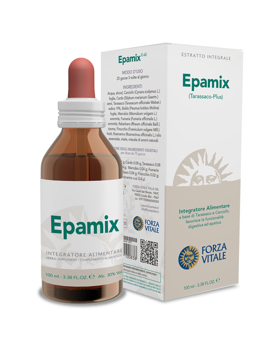 Acqua, Alcool, Carciofo (Cynara scolymus L.) foglie, Cardo (Silybum marianum L.) semi, Tarassaco (Taraxacum officinale Weber) radice, Boldo (Peumus boldus molina) foglie, Marrubio (Marrubium vulgare L.) sommità, Fumaria (Fumaria officinalis L.) sommità, Rabarbaro (Rheum officinale Bail.) rizoma, Finocchio (Foeniculum vulgare Mill.) frutti, Rosmarino (Rosmarinus officinalis L.) olio essenziale, Miele, Miscela di aromi naturali.