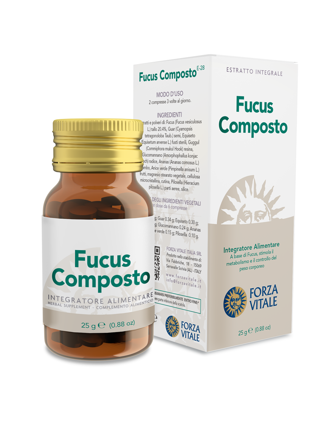 Estratti e polveri di: Fucus (Fucus vesciculosus L.) tallo 20,4%, Guar (Cyamopsis tetragonoloba Taub.) semi, Equiseto (Equisetum arvense L.) fusti sterili, Guggul (Commiphora mukul Hook) resina, Glucomannano (Amorphophallus konjac) radice, Ananas (Ananas comosus L.) gambo, Anice verde (Pimpinella anisum L.) frutti, Magnesio stearato vegetale, Cellulosa microcristallina, Pilosella (Hieracium pilosella L.) parti aeree, Silice.