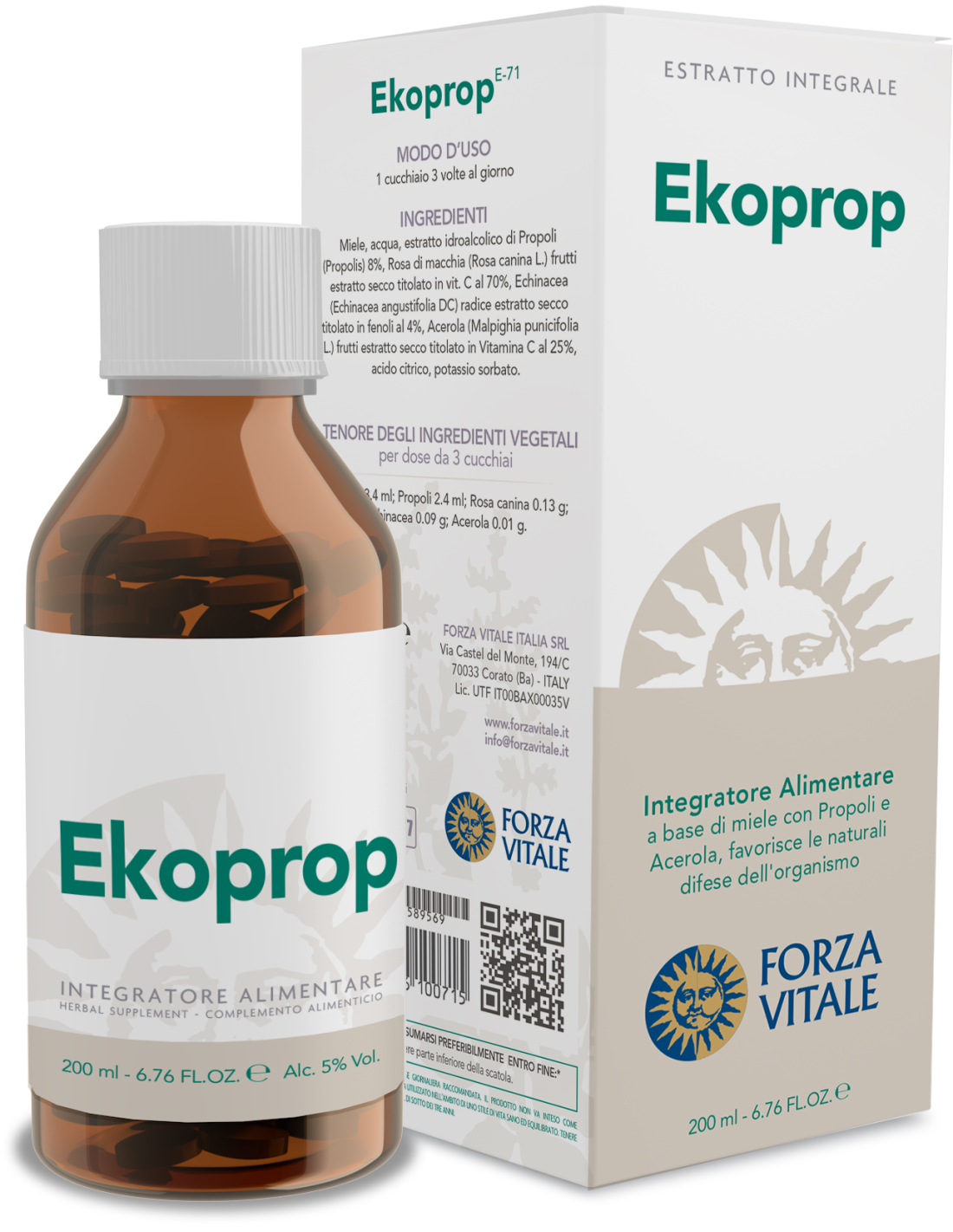 Il Miele contiene fino al 3% di sostanze minerali, tra cui ferro, fosforo, potassio, calcio, magnesio e zinco; è ricco anche di vitamine B1, B2, B6, vitamina C, acido pantotenico, acido folico e pigmenti vegetali come il carotene. È un vero toccasana per la salute in generale, conosciuto ed apprezzato fin dall’antichità. Della Propoli è stata confermata, in diversi studi scientifci svolti in Romania, Unione Sovietica, Svizzera e Svezia, la spiccata azione antibatterica, antinfettiva, antisettica, antibiotico-simile, antinfluenzale. La Rosa canina L. o Rosa di Macchia è una delle numerose specie di rose selvatiche, comuni nelle nostre campagne; essa è particolarmente ricca di vitamina C, ma contiene anche vitamine A, B, E, K, P, PP, B1 e B2, carotenoidi, pectine e tannini; grazie a tutti questi principi ha una forte azione vasoprotettrice, antinfammatoria, antinfluenzale e diuretica. Dell’Acerola si utilizzano i frutti che sono molto ricchi in acido ascorbico, vitamine A, B1, B2, C, PP e acido malico; i suoi componenti l’hanno resa famosa sin dall’antichità per le sue proprietà vitaminizzanti, astringenti, antinfiammatorie, antinfettive e antinfluenzali. L’uso tradizionale dell’Echinacea Angustifolia risale agli indiani d’America, di essa si usano le radici e le parti aeree. Ha proprietà batteriostatiche e virus-statiche, proprietà già verifcate su numerosi ceppi batterici e virali. Sui microrganismi agiscono direttamente le alchilamidi e le poliine in essa contenuti; gli eteroxilani stimolano diverse linee cellulari immunitarie per induzione della liberazione di interleuchina-1 (macrofagi, linfociti B e T). Svolge un’azione riepitelizzante in caso di ferite, grazie al principio attivo echinacoside che è in grado di inibire l’enzima jaluronidasi rallentando la velocità di penetrazione dei microgranismi nei tessuti, accelerando la guarigione delle ferite e al tempo stesso diminuendo il rischio di infezioni.
