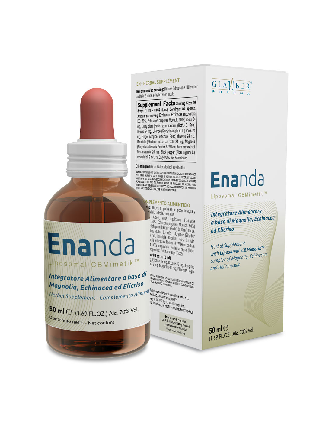 Enanda è il nuovo integratore della linea Glauber Pharma studiato per sostenere adeguatamente il funzionamento del Sistema Endocannabinoide perché capace grazie ai suoi ingredienti di stimolare la formazione dei cannabinoidi prodotti dal nostro organismo (endocannabinoidi) e di prolungarne i benefici in modo naturale. Il Sistema Endocannabinoide deve il suo nome alla pianta di Cannabis in considerazione del fatto che alcuni fitocananbinoidi in essa presenti, imitano gli effetti degli endocannabinoidi dell’organismo. Ma spieghiamo meglio la distinzione tra cannabinoidi, endocannabinoidi e fitocannabinoidi. I cannabinoidi sono le chiavi di accesso ai “recettori” del Sistema Endocannabinoide e rivestono un ruolo decisivo nelle attività cognitive, motorie, metaboliche e affettive dell’organismo. Esistono due tipologie di cannabinoidi: gli endocannabinoidi, presenti all’interno del nostro corpo e gli esocannabinoidi (eso = esterni al nostro corpo). Tra questi rientrano ovviamente i fitocannabinoidi presenti all’interno di alcune piante (ovvero qualsiasi prodotto naturale di origine vegetale in grado di agire direttamente con i recettori dei cannabinoidi). Il compito dei cannabinoidi è quello di legarsi ai recettori CB1 e CB2 del Sistema Endocannabinoide per consentire l’attivazione dei suoi processi, essenziali per il nostro generale benessere psicofisico. I recettori CB1 si trovano prevalentemente nel cervello e in quantità minore in altre parti del corpo. I CB1 grazie al rilascio di determinati neurotrasmettitori proteggono il Sistema Nervoso Centrale dall’iperstimolazione o dalla inibizione generata da altri neurotrasmettitori. I recettori CB2 invece, spaziano nelle altre terminazioni nervose dell’organismo compreso il Sistema Immunitario. In natura, oltre alla Cannabis, esistono molte piante che “possiedono” effetti cannabinoidi o che ne “imitano” i processi. Tali piante, definite “cannabimimetiche”, svolgono funzioni positive sull’organismo senza alcuni limiti e problematiche (anche di natura normativa) legate all’uso della Cannabis. Tra le più comuni piante “cannabimimetiche” possiamo citare l’Echinacea, l’Elicriso, la Magnolia o il Pepe Nero. L’Echinacea ad esempio è il riferimento non solo per sostenere naturalmente l’organismo in presenza del raffreddore ma anche come fisiologico supporto in caso di artrite, dolori e mal di testa. Tutto questo grazie ai suoi cannabimimetici che si interfacciano con il SEC e i recettori CB2 attivi nella regolazione del sistema immunitario e delle infiammazioni.