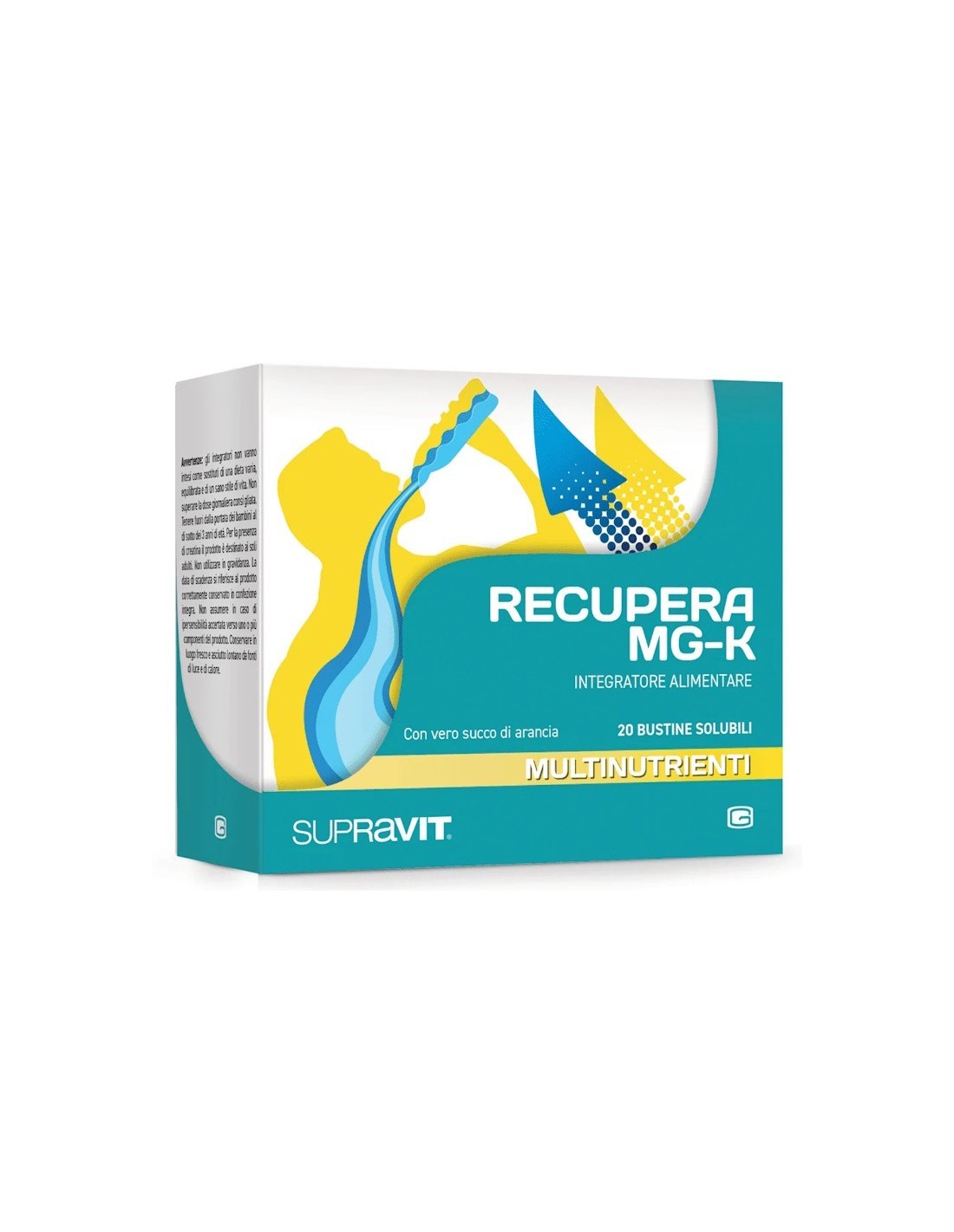 Descrizione: Supravit Recupera MG-K FAST è un integratore alimentare a base di Magnesio, Potassio e Acido L-Aspartico. Il Magnesio contribuisce al normale metabolismo energetico. Il Potassio contribuisce alla normale funzione muscolare.