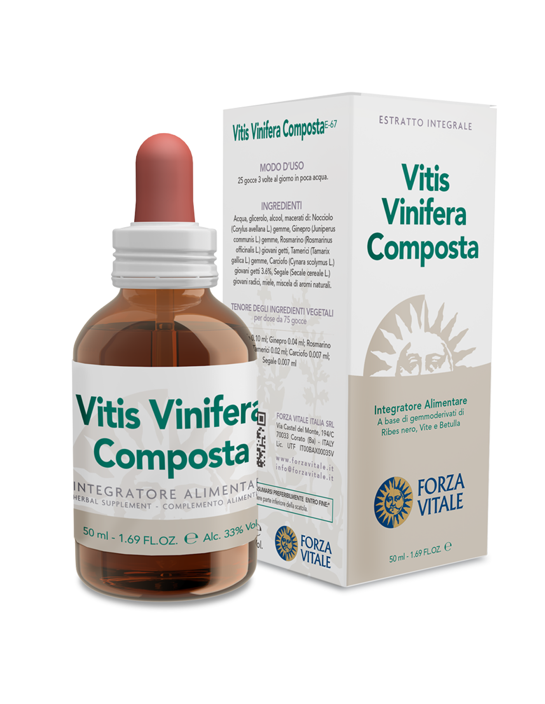 Acqua, Alcool, licerolo, Macerati di: Ribes nero (Ribes nigrum L.) gemme, Vite (Vitis vinifera L.) gemme 28%, Pino (Pinus montana Mill.) gemme, Betulla (Betula pubescns Ehrh.) gemme, Abete bianco (Abies pectinata DC.) gemme, Miele, Miscela di aromi naturali.